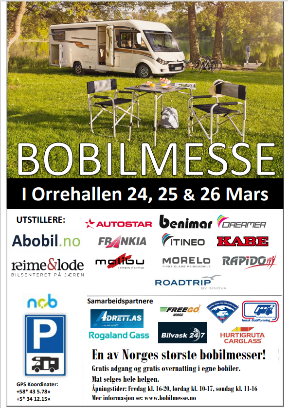Bobilmesse i Orrehallen Publisert av Tor Henriksen den 02.03.23. Da nærmer tiden seg til at en av Norges største bobilmesser avholdes. Det er muligheter for overnatting i egen bobil utenfor hallen og erfaringsmessig er det mange bobileiere som besøker messen og overnatter.Lenke til messesiden